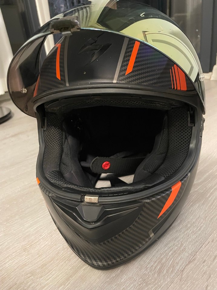 Desenli, kemerli, koyu gri ve siyah tonlarında, sentetik kumaştan yapılmış motosiklet kaskı, sokak stiline uygun.