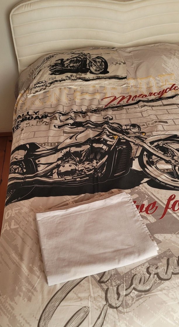 Gri ve beyaz tonlarda motosiklet baskılı nevresim takımı, yanında sade beyaz çarşaf ile birlikte gelir. ️Tek kişiliktir. Temiz, herhangi bir sorunu yok.Nevresim, çarşaf, yastık kılıfı olmak üzere 3 parçadan olusmaktadir.Fiyatı uygun tutuyorum
