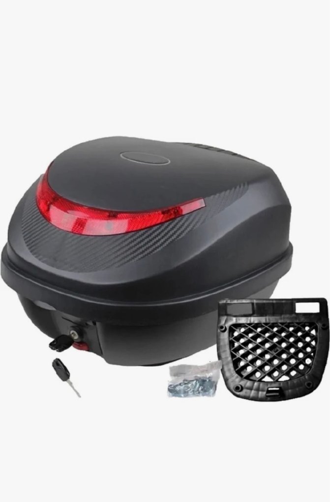 Kilitli siyah bagaj organizerı, kırmızı reflektörlü, montaj plakası ve anahtarlarla birlikte gelir.
