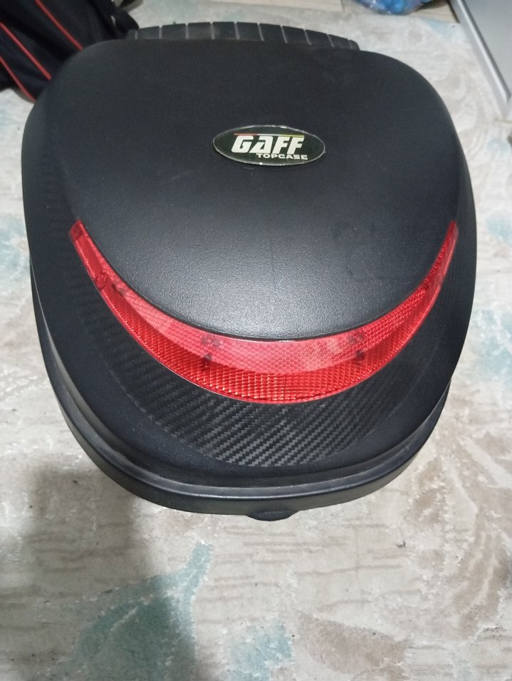Kilitli tasarıma ve baskılı desene sahip siyah biker motosiklet kaskı. Koyu plastikten üretilmiş, kırmızı reflektörlü ve GAFF markalı.(kapak çok zor açılıyor bilginiz olsun) göründüğü gibidir ️