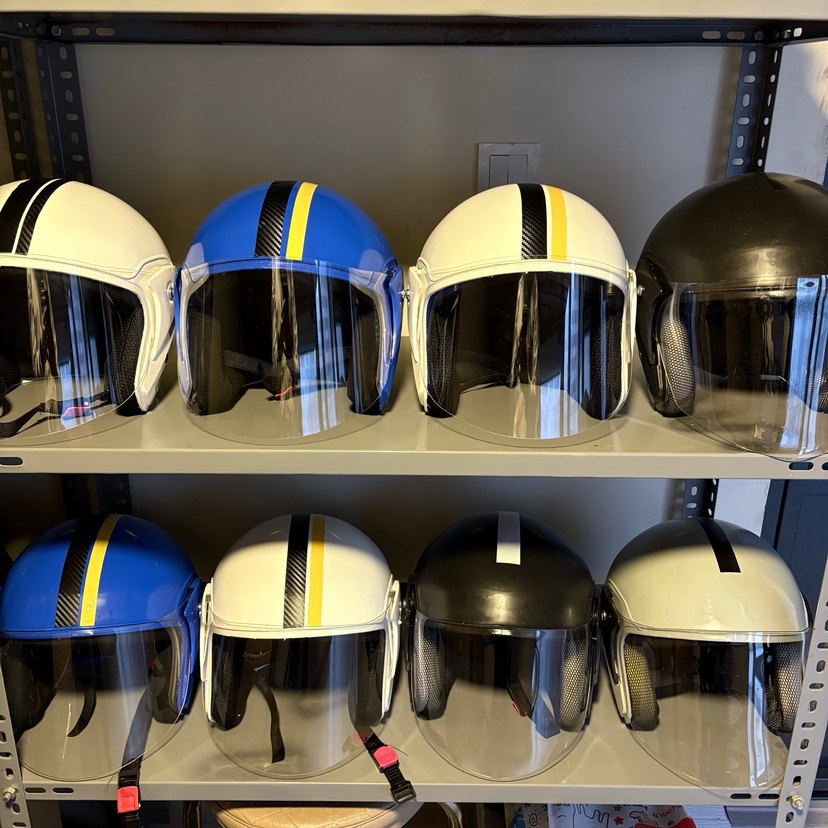 Mavi beyaz siyah gri renkli, koyu çizgili ve bağlama özelliğine sahip plastik biker motosiklet kaskı, sokak stiline uygun.