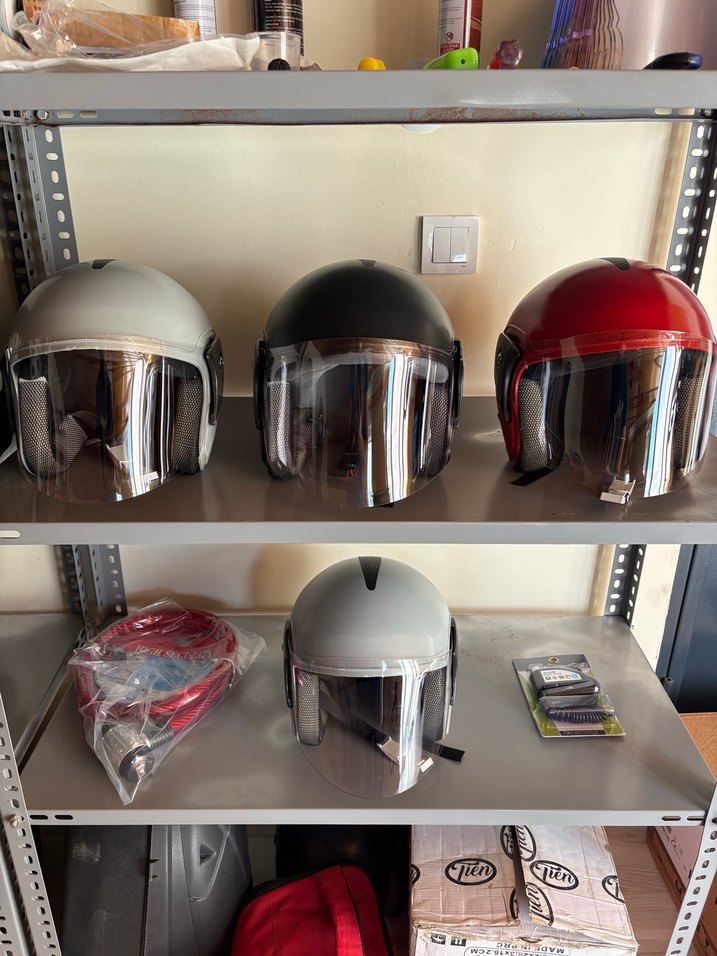 Parlak gri metal motosiklet kaskı, şeffaf vizörlü, retro biker tarzında sade ve desensiz tasarım. Standart beden…