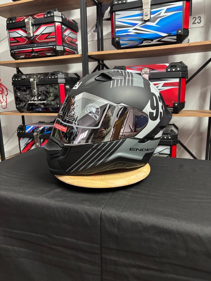 Siyah ve gri renklerde, baskılı desenli, lastik malzemeden yapılmış ve tokalı kayışa sahip rock punk tarzında motosiklet kaskı. ️