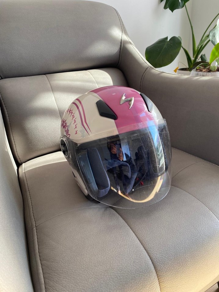 Vizöründe çizikler var. Parlak pembe baskılı biker motosiklet kaskı, dayanıklı plastikten üretilmiş. Şeffaf vizörlü ve minimalist tarzda, rock punk havası yansıtıyor. ️
