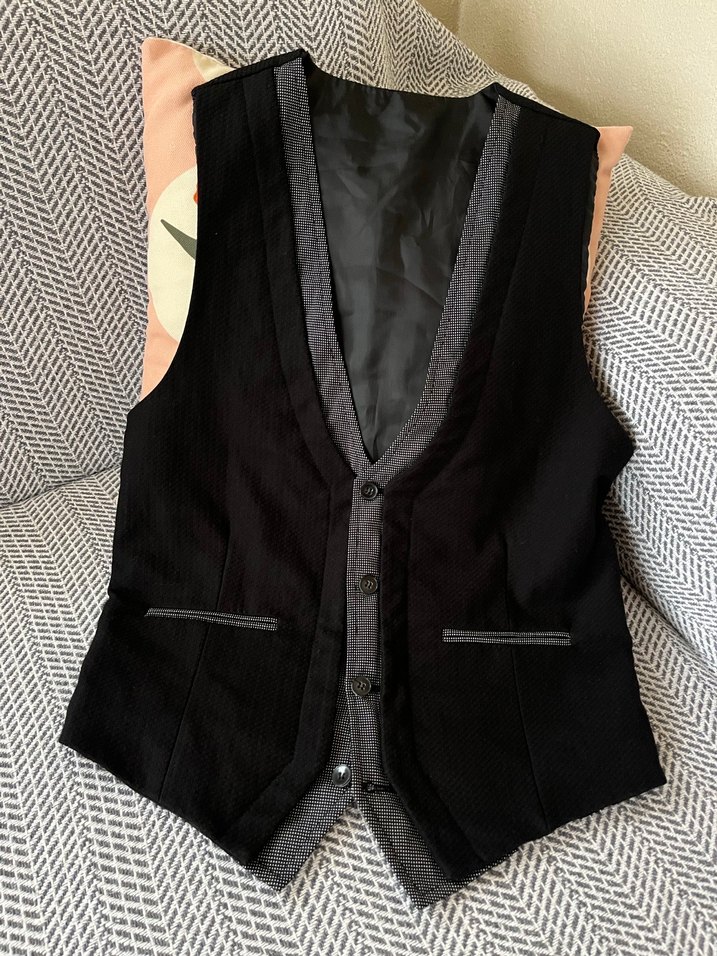 Motto marka S beden yelek. Kumaş içeriği %80 pamuk, %20 polyesterdir. Omuz hizasından uzunluğu 55 cm, koltuk altından genişliği 45 cm’dir. Günlük kullanıma uygundur. Deformesi yoktur, tertemiz durumdadır.