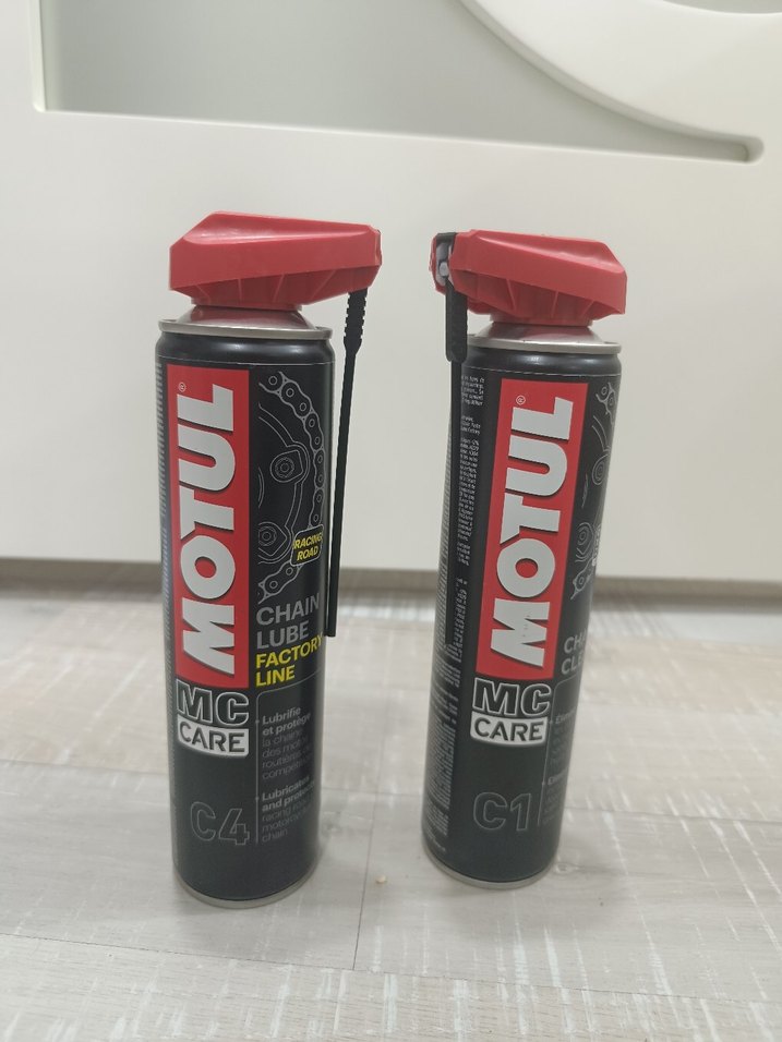 Motul MC Care C1 ve C4 zincir yağları, motosiklet zincir bakımı için sprey kutuda, kırmızı kapaklı olarak sunulmaktadır. sıfır ürün