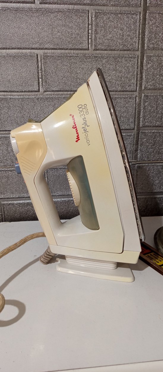 Moulinex marka beyaz ütü, rahat tutma yeri ve düzgün tabanıyla etkili ütüleme sağlar. Kompakt tasarıma ve açık renge sahiptir. ⚪