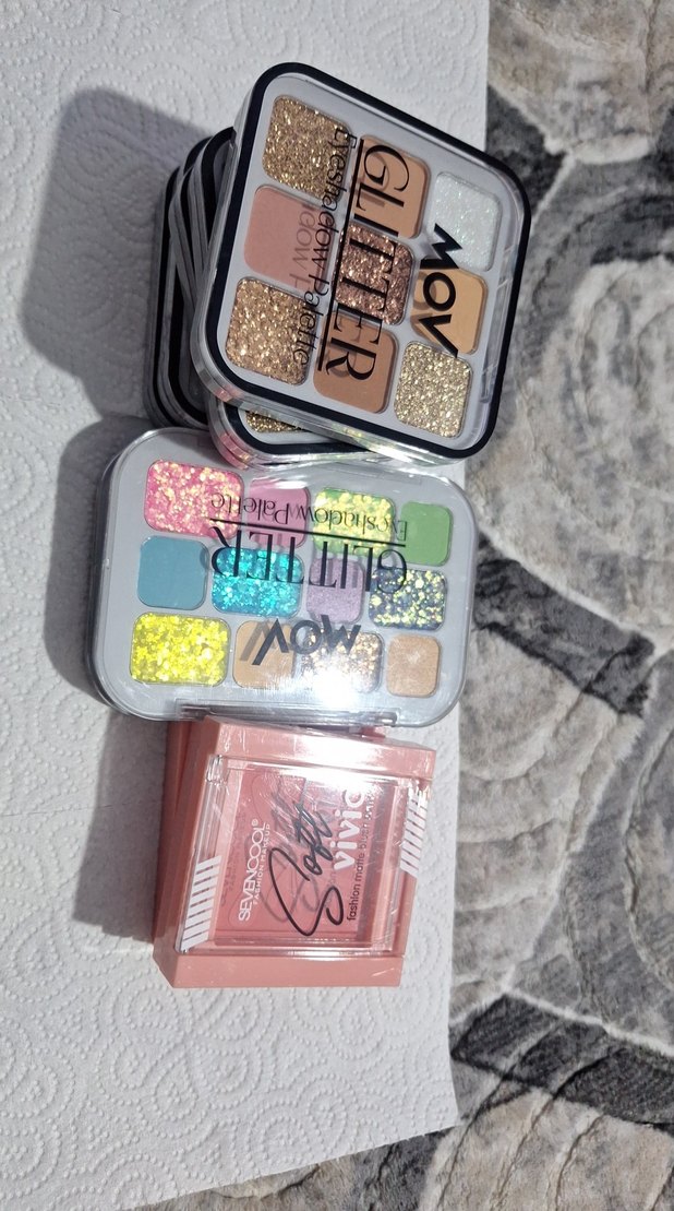 MOV markasına ait, canlı ve açık tonlarda çok renkli simli far paletleri. Ayrıca yumuşak pembe tonlarda küçük bir palet içerir. ✨