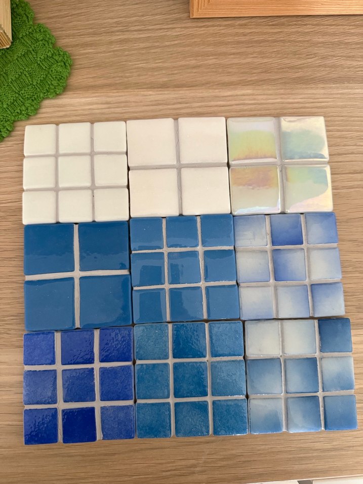 Farklı tonlarda mavi ve beyaz seramik karolar, parlak ve mat yüzeylerle düzenlenmiş. Dekoratif kullanım için uygundur. Mozaik seramik bardak altlığı Adet100₺ 6adet500₺