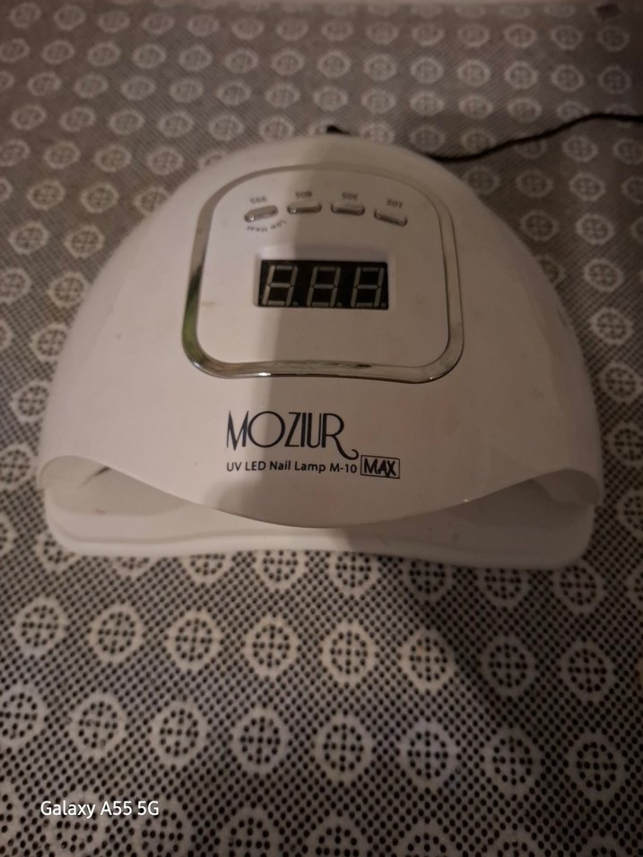 MOZIUR markalı beyaz UV LED tırnak kurutucu, dijital ekran ve farklı zaman ayarları ile tırnakları hızlıca kurutmak için kullanılır.