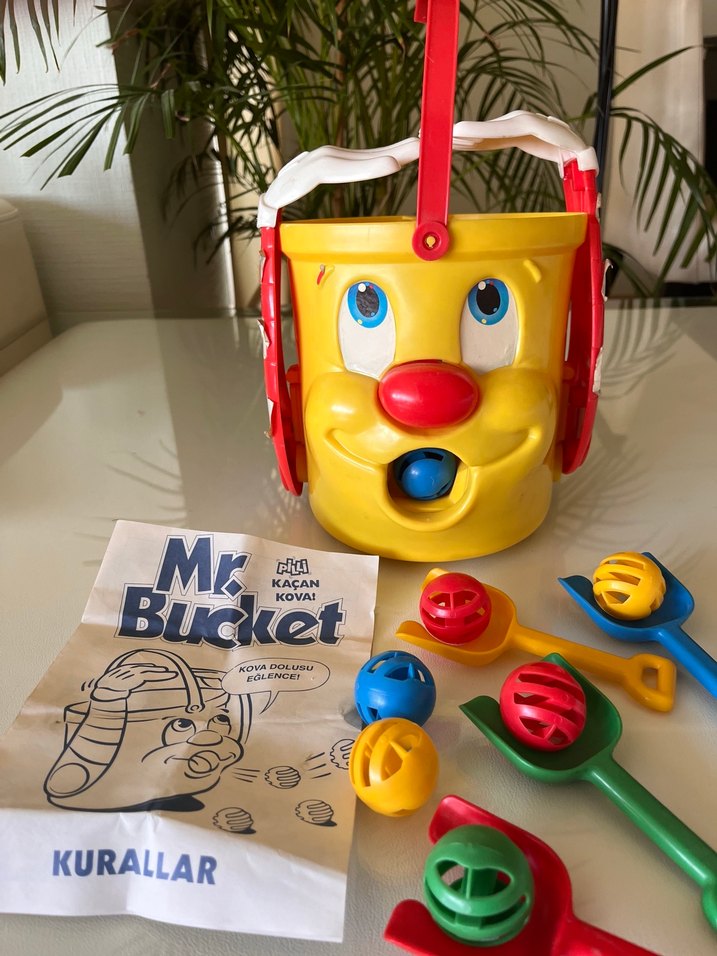 Mr. Bucket, Milton Bradley tarafından 1992 yılı civarlarında ve daha sonra tekrar 2007'de yayımlanan oyuncaktır. Plastikten yapılma, motorla çalışan ve ağzından farklı renklerde toplar fırlatan bir oyuncaktır. Oyuncu(lar) Mr. Bucket'ın fırlattığı renkli topları, toplarla aynı renkteki küreklerle toplamalıdır ve Mr Bucket'ın içine geri koymalıdır. 20 TL fiyat simgesel olarak yazılmıştır. Oyuncağın kollarında onarılabilir deformasyon mevcuttur. Tamir edilebilir. Ürünlerimin içinden 1000 TL nın üzerinde alım yapanlara hediye olarak verilecektir.