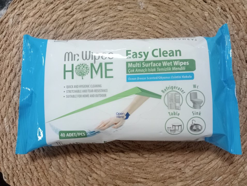 Mr. Wipc Home Easy Clean 40 adet çok amaçlı ıslak temizlik mendili, esnek ve yırtılmaz yapıda, okyanus esintisi kokulu, ev ve dış mekanlarda kullanılabilir.