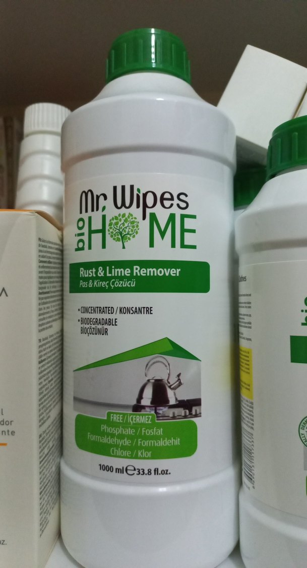 Mr Wipes Bio Home Pas ve Kireç Çözücü, fosfat, formaldehit ve klor içermeyen, konsantre ve biyolojik olarak çözünebilen 1000ml'lik bir temizlik ürünüdür.
