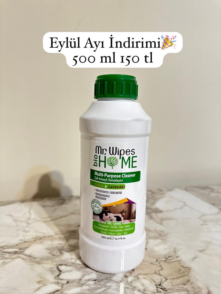 Mr Wipes çok amaçlı temizleyici, lavanta kokulu, 500 ml şişede. Eylül ayı indirimiyle sunuluyor.