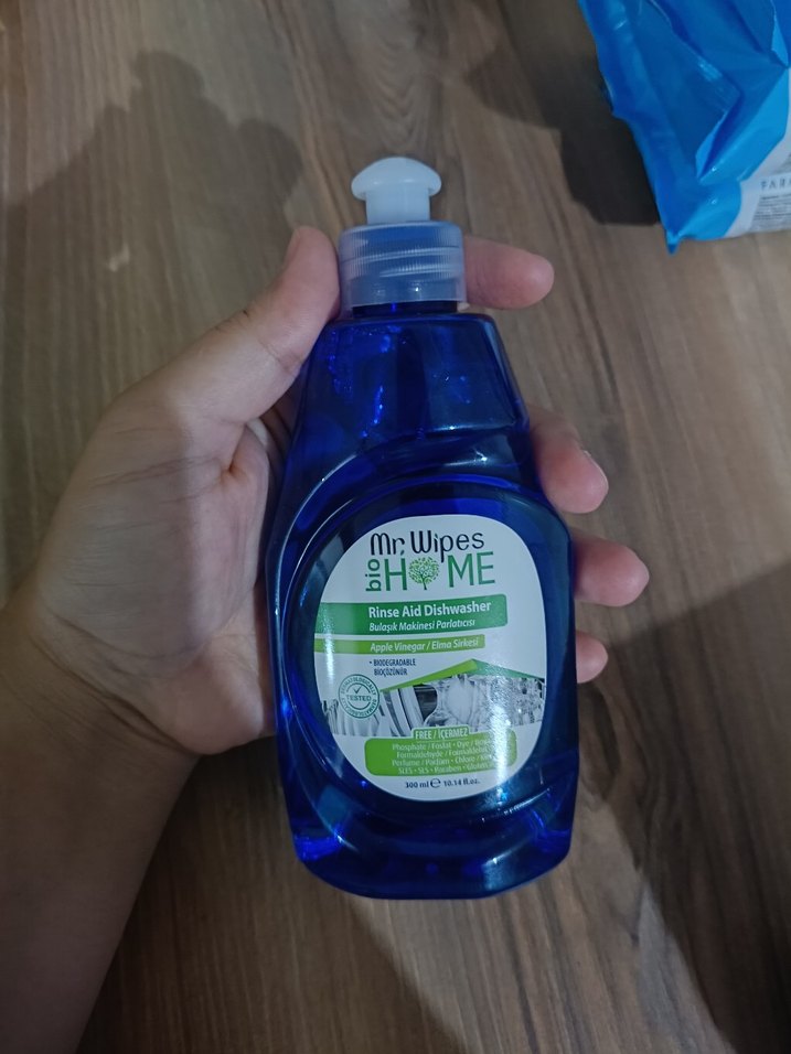 Mr Wipes Home bulaşık makinesi parlatıcısı, kurutma ve parlaklık sağlar. Elma kokulu, 300 ml mavi şişede.