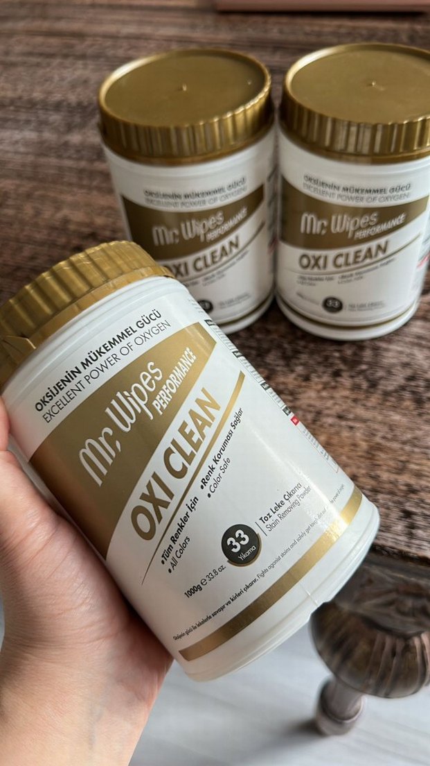 Mr Wipes Oxi Clean, mükemmel oksijen gücüne sahip altın renkli toz, leke çıkarma ve renk koruma sağlar. Her kutuda 33 yıkama bulunur. ✨