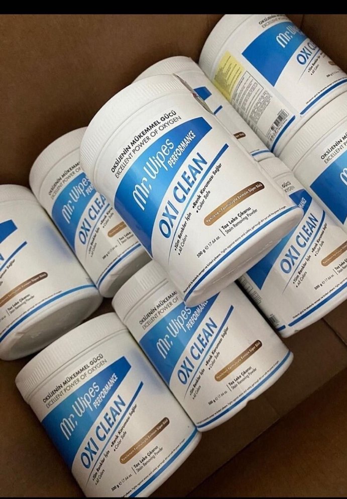 Mr. Wipes Oxi Clean, lekeleri çıkarmak ve beyazlatmak için kullanılan beyaz toz temizlik ürünüdür. Kullanımı kolay kutuda sunulmuştur.