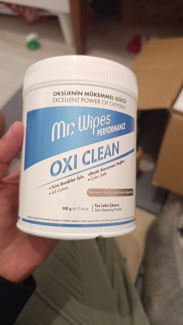 Mr. Wipes Oxi Clean, leke çıkarıcı toz olup mükemmel oksijen gücü sağlar. Tüm renkler için uygundur ve renk korumasına yardımcı olur. 500 gramlık pakettir.