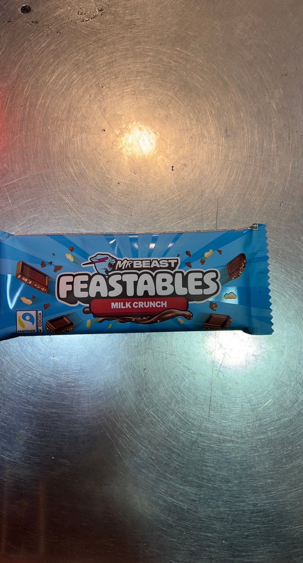 MrBeast Feastables Sütlü Kırıntılı çikolata barı, içinde çıtır parçalar bulunan yumuşak sütlü çikolatadır.