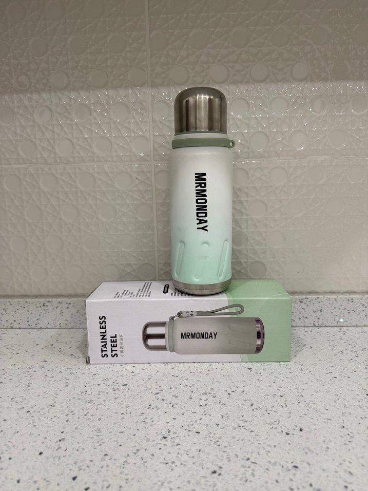MRMONDAY açık yeşil çocuk termosu, paslanmaz çelik gövde ve güvenli kapak ile sıcak veya soğuk içecekler için uygundur.