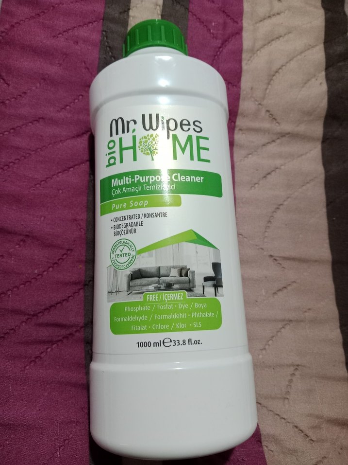 MrWipes bio HOME çok amaçlı temizleyici, saf sabun formüllüdür. Konsantre, biyobozunur ve fosfat, boya, formaldehit, ftalat, klor, SLS içermez.