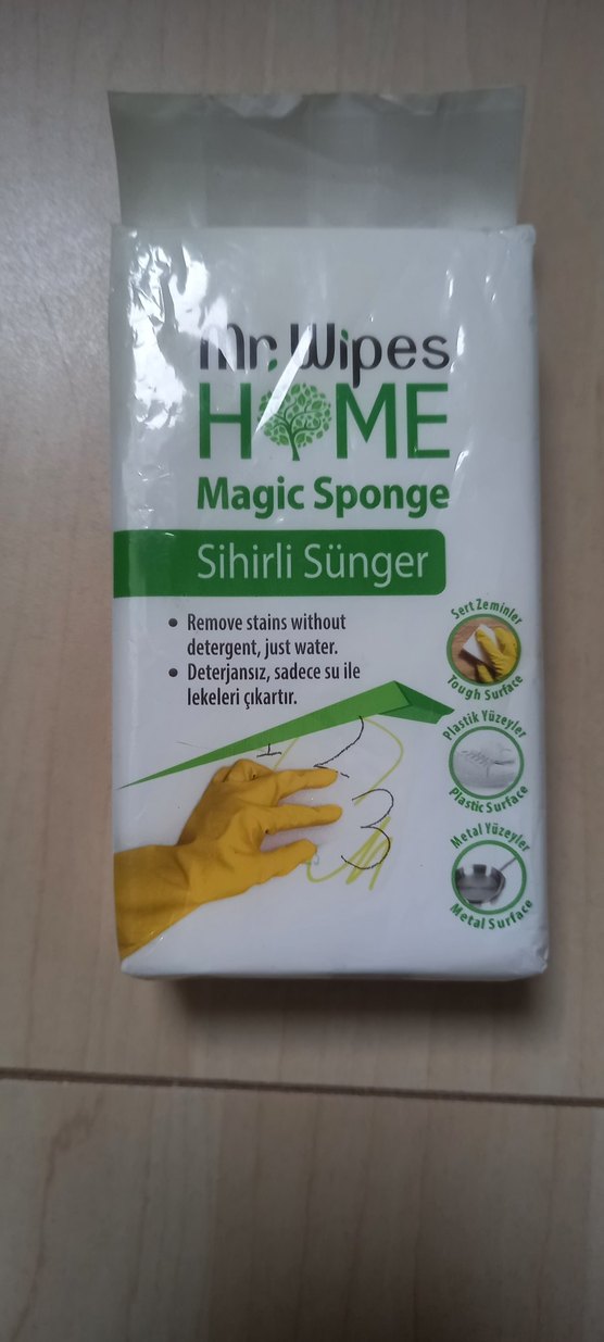 MrWipes Home Sihirli Sünger, deterjan kullanmadan sadece su ile lekeleri çıkarır. Kumaş, plastik ve metal yüzeylerde etkilidir. ✨