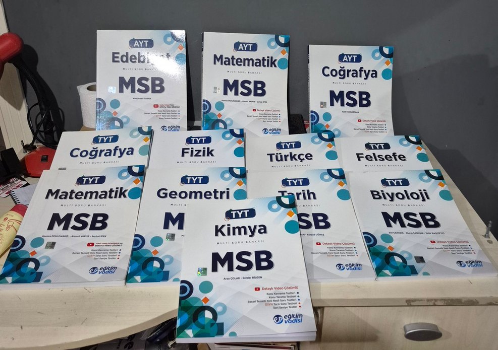 MSB soru bankası seti, Matematik, Coğrafya, Biyoloji, Fizik, Kimya, Türkçe, Felsefe, Tarih, Edebiyat ve Geometri gibi AYT ve TYT derslerini içerir. 3 ayt 9 tyt kitabı içerir. TAMAMEN SIFIRLAR Ancak tyt Matematik bi 50 sayfası falan *kurşun* kalemle çözüldü. silinebilir. PIYASADA TANESI 500 TL Seti yaklaşık 6000 tl ediyor.