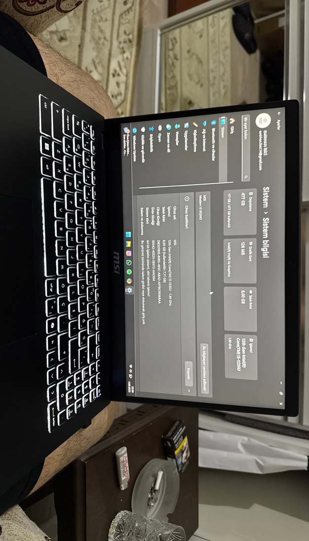 Işıklı klavyeye ve ince çerçevelere sahip siyah MSI laptop, sistem bilgileri ekranında gösteriliyor. Sifir 1 ay olmadi alali herseyi duruyor