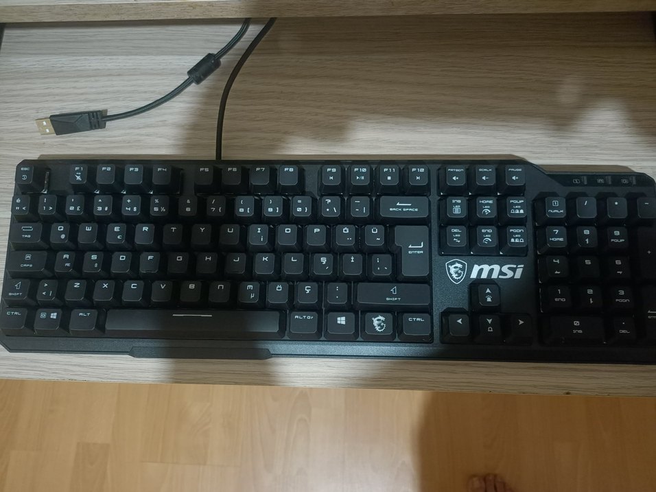MSI siyah kablolu mekanik klavye, beyaz yazılı koyu tuşlara ve sayısal tuş takımına sahiptir. Sağlam yapısı ve kablolu bağlantısı ile güvenilir kullanım sunar. ⌨️