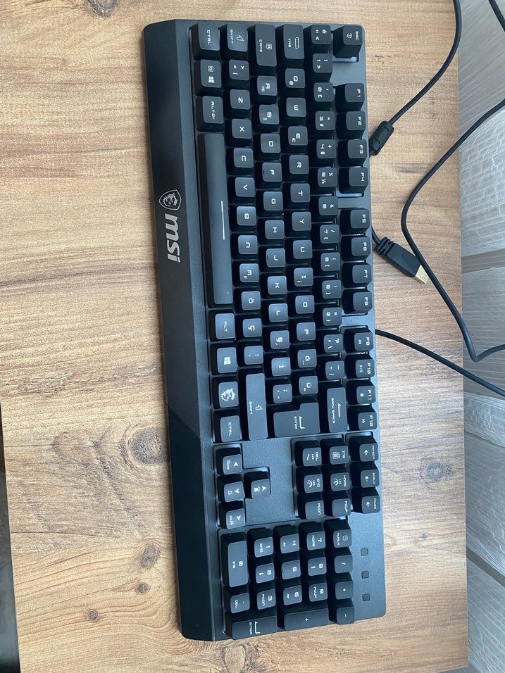 MSI siyah kablolu mekanik klavye, tam düzen ve sayısal tuş takımı ile dayanıklı tuşlar sunar, rahat yazma deneyimi sağlar.