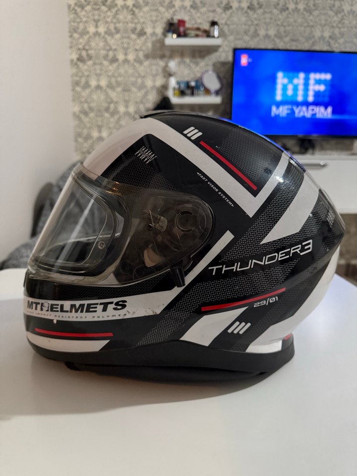 MT Thunder 3 kask, L beden. Genel durumu çok temizdir,çatlak vs yoktur. Orijinal 1.500 TL değerinde Pinlock vizörü üzerinde takılıdır, bu sayede buğulanma yapmaz. Güneş vizörü mevcuttur. Kaskın tüm mekanizmaları sorunsuz çalışıyor. İç pedlerde deformasyon veya koku yok. Hiçbir tamir/oynama yapılmadı. Kaskın üst kaplamasında soyulmalar mevcut. Güvenli, rahat ve uygun fiyatlı bir kask arayan için ideal.