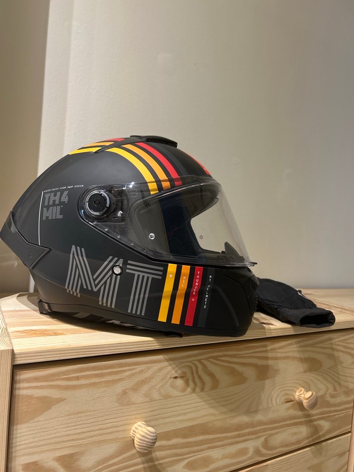 MT Thunder 4 Sv Mil C2 Şeffaf Vizörlü Mat Siyah Motosiklet Kaskı ve eldiven seti Kask yeni alınmıştır Siyah, baskılı avant-garde tasarımlı biker kask, tokalı kayış ve şeffaf vizör ile koruma sağlar. Kauçuk malzemeden dayanıklıdır.