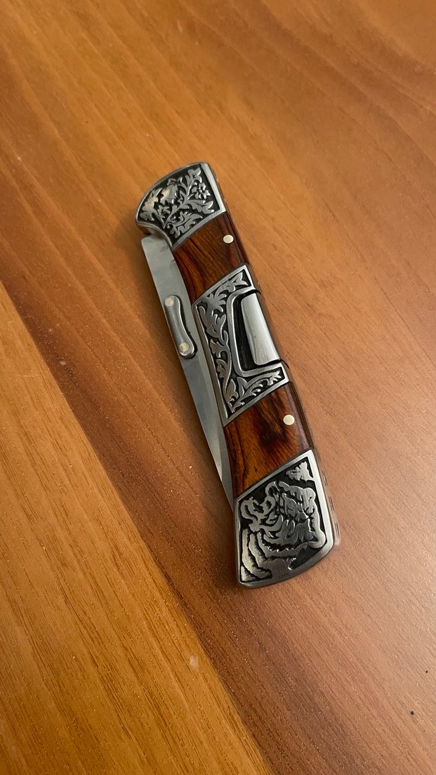 Kahverengi ahşap saplı, metal işlemeli cep bıçağı, dayanıklı ve şık tasarıma sahiptir.