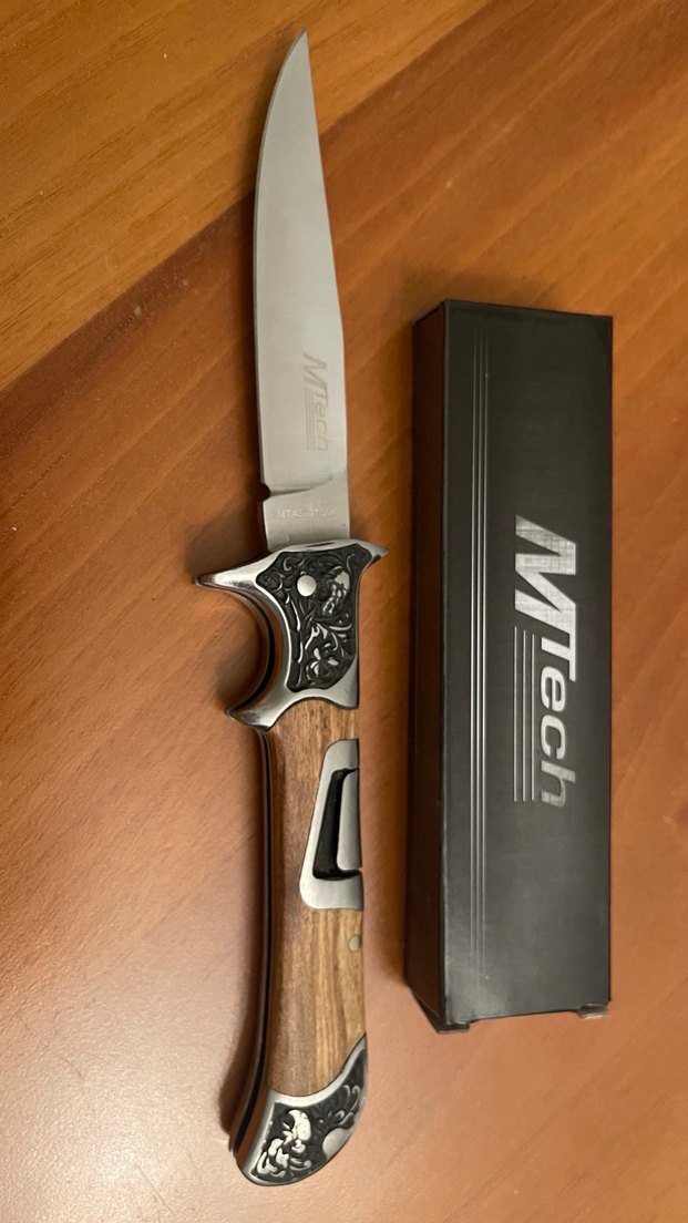 MTech markalı, detaylı metal korumalı ve kahverengi ahşap saplı bıçak. Siyah kutusu ile birlikte gelir.