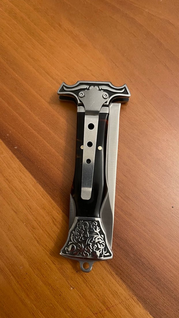 Bu koyu renkli katlanır cep bıçağı, dekoratif kulp ve paslanmaz çelik bıçak içerir.