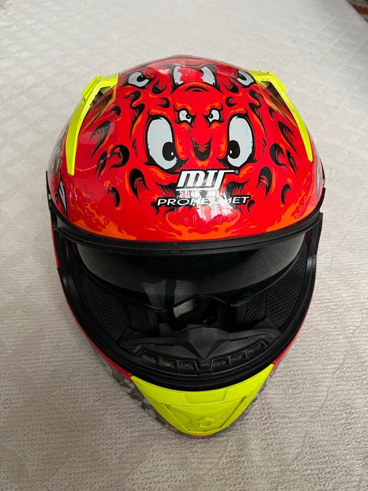 Bu renkli kırmızı motosiklet kaskı, kemerli kapanışa sahip baskılı tasarımıyla rock punk ve grunge punk tarzını yansıtıyor. Plastik malzemeden üretilmiştir. ️