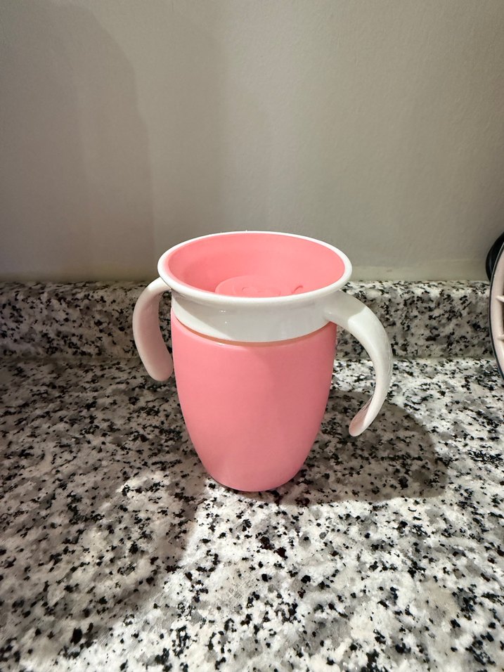 Pastel pembe renkte, tutması kolay beyaz kulplu bebek biberonu.