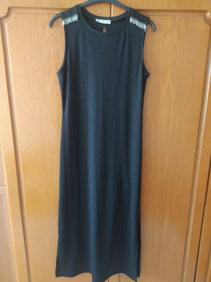 Kolsuz, yuvarlak yaka ve regular fit siyah uzun elbise, yumuşak sentetik kumaştan. Omuzlarında metal detaylar bulunmaktadır. Bileklere yaklaşan boyu olup diz hizasından iki yandan yırtmacı bulunuyor. Çok kullanışlı her ortama uyum sağlayan bir parça az kullanılmış olup yeni gibidir. Herhangi bir defosu yoktur.