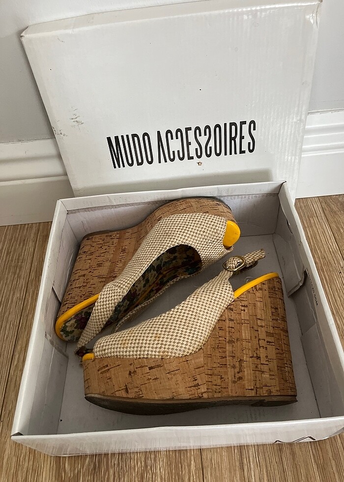mudo, mantar topuk ayakkabı. Çiçek tokaları vardı düşmüş. bazı lekelenmeler olmuş o sebeple fiyatı düşük tuttum