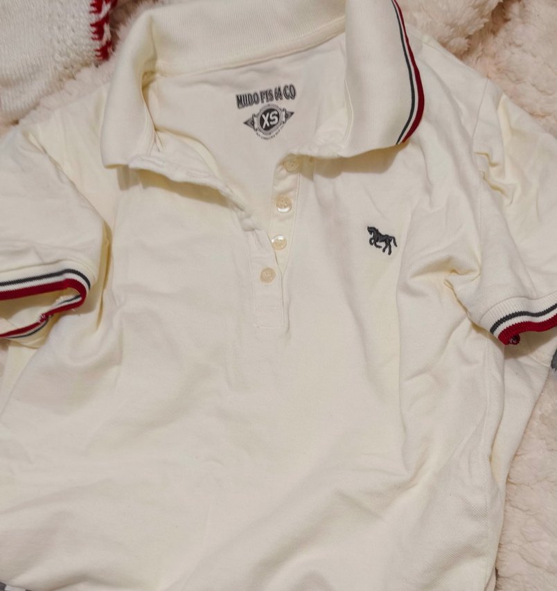 Dar kesim, beyaz pamuklu polo tişört, kısa kollu ve düğmeli. Yaka ve kollarda ince şerit detaylar bulunur, günlük sokak stili için uygundur. koltuk altı genişliği 40cm, boy 60cm yeniden farksız