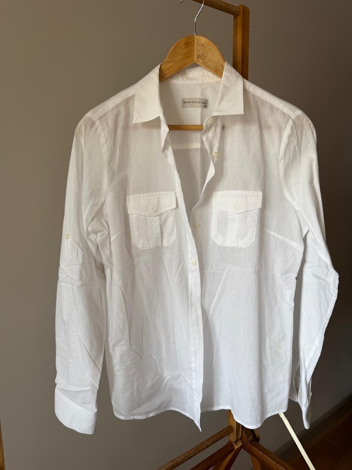 Düğmeli cep detaylı, yakalı, uzun kollu beyaz gömlek. Minimalist ve düz tasarımıyla günlük kullanıma uygun.