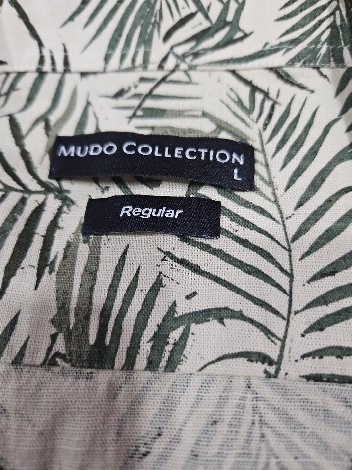 Mudo Collection markalı, yeşil ve gri renklerde, yaprak desenli, regular kesim erkek sokak giyim etiketi. göğüs 53 cm uzunluk 72 cm kol boyu 21 cm kol genişliği 18 cm