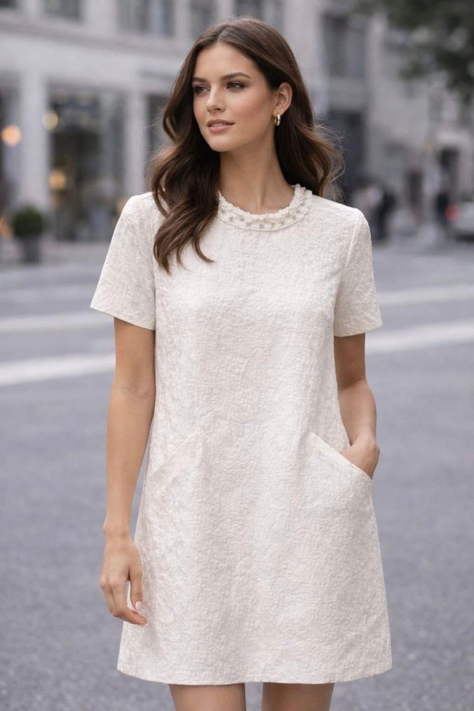 Mudo Collection İnci Detaylı Jakarlı Beyaz Elbise - 38 Beden