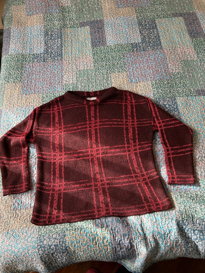 mudo collection kadın kazak çok az kullanıldı s beden geniş kesim dökümlü bir kazak özellikle tayt vb üzeri için ideal son fiyat Bordo renkli, örgü yün kumaştan yapılmış, bol kesim ve uzun kollu, yuvarlak yakalı bir kazak. İnce kare desenleriyle günlük kullanım için uygundur.