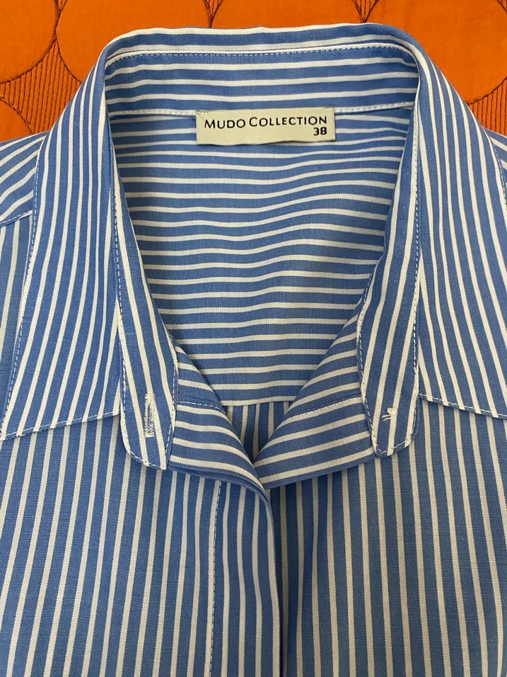 Mudo Collection kadın gömlek, tekne yakalı ve düğmeli. Pamuk kumaştan, normal kesim veMavi ve çizgili deseniyle günlük ve iş stiline uygun.