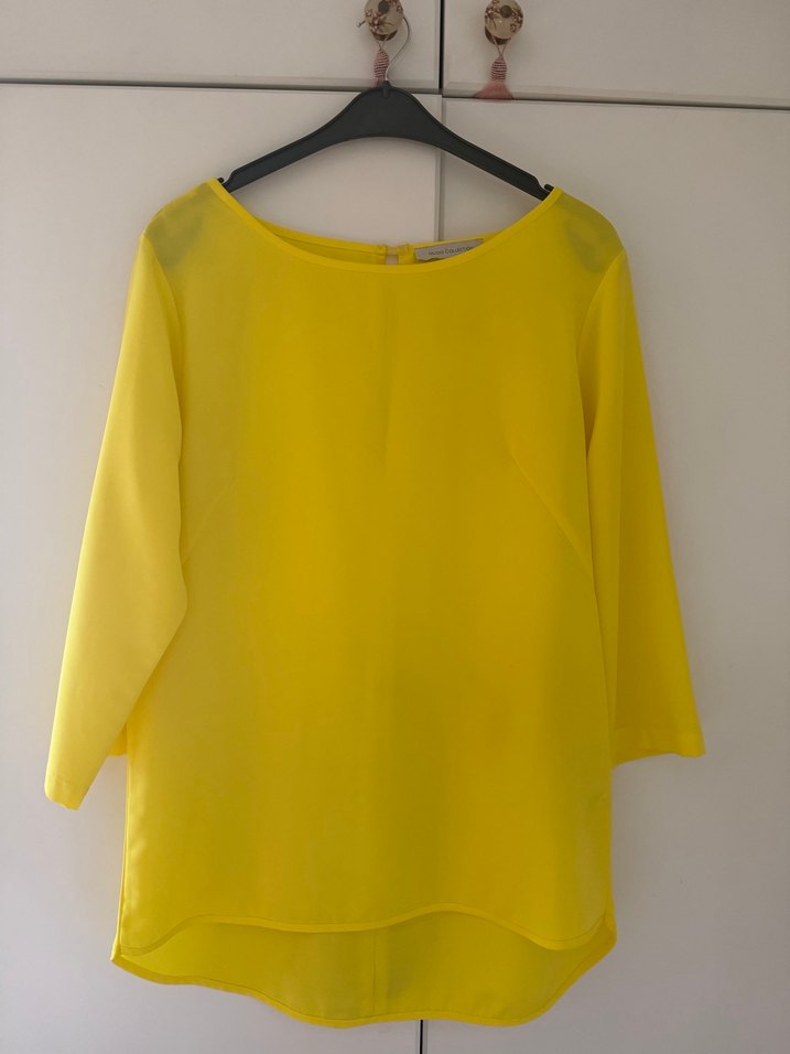 Sarı renkte, salaş kesim, yuvarlak yaka ve uzun kollu kadın bluz. Sırtında hafif penceresi var. İpek gibi kumaştan, drapeli ve parlak görünümlü, günlük kullanıma uygun. Hiç giyilmedi.