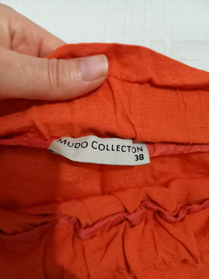 Keten kumaştan, düğmeli, baskılı ve turuncu renkli, bol kesim etek. Normal midi boyda, Mudo Collection 38 beden. Deformesi yok. ölçüleri görsellerde mevcut