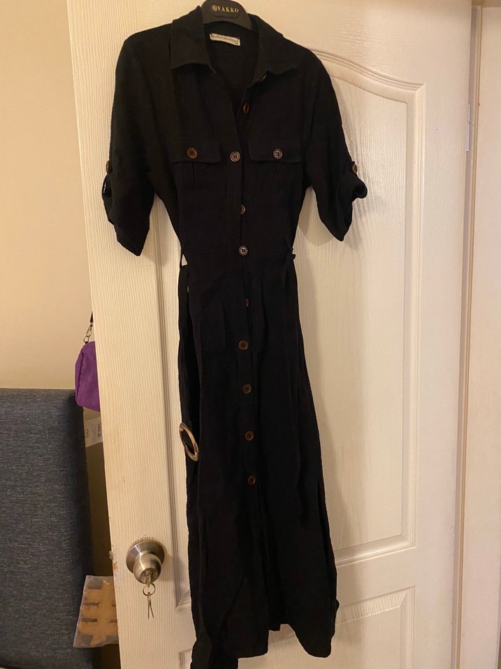 Siyah keten uzun elbise, düğmeli, kemerli ve günlük kullanıma uygun rahat kesime sahiptir. Satışlarım hediyelidir