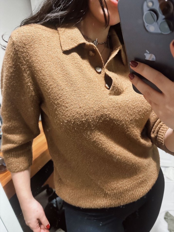 Bu kahverengi örme kazak, yakalı ve düğmeli detaylara sahiptir. Uzun kollu, bol kesim ve normal midi boyunda, günlük sokak stiline uygundur. ✨