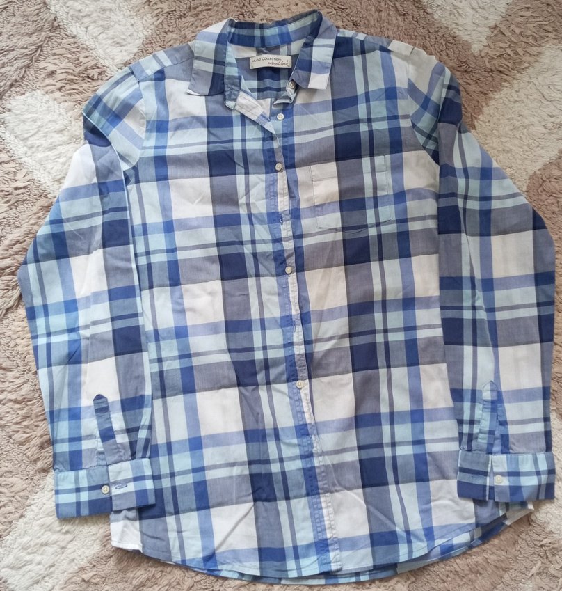 Pamuk kumaştan, uzun kollu ve düğmeli mavi kareli kadın gömleği. Regular fit ve yakalı tasarımla günlük rahat stil için uygundur.